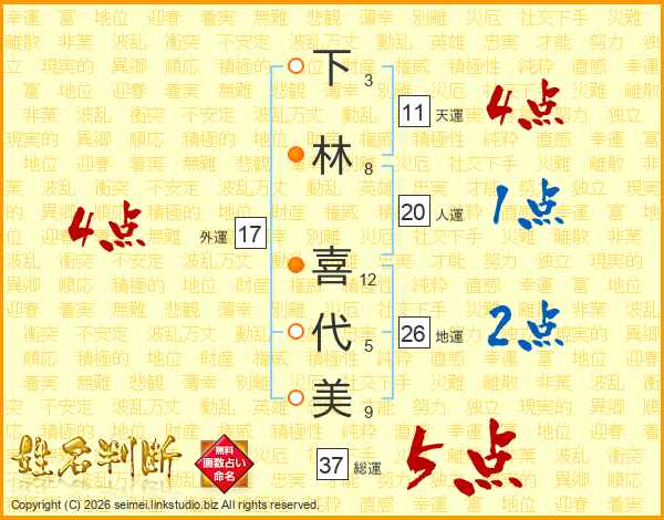下(3画)林(8画) 喜(12画)代(5画)美(9画)