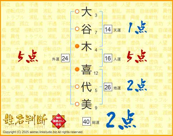 大(3画)谷(7画)木(4画) 喜(12画)代(5画)美(9画)