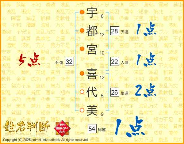 宇(6画)都(12画)宮(10画) 喜(12画)代(5画)美(9画)