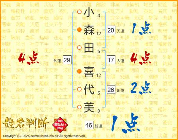小(3画)森(12画)田(5画) 喜(12画)代(5画)美(9画)