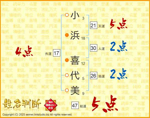小(3画)浜(18画) 喜(12画)代(5画)美(9画)