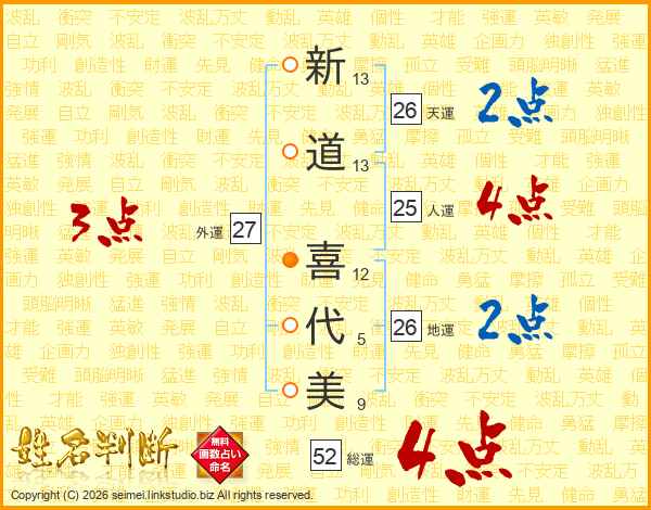 新(13画)道(13画) 喜(12画)代(5画)美(9画)