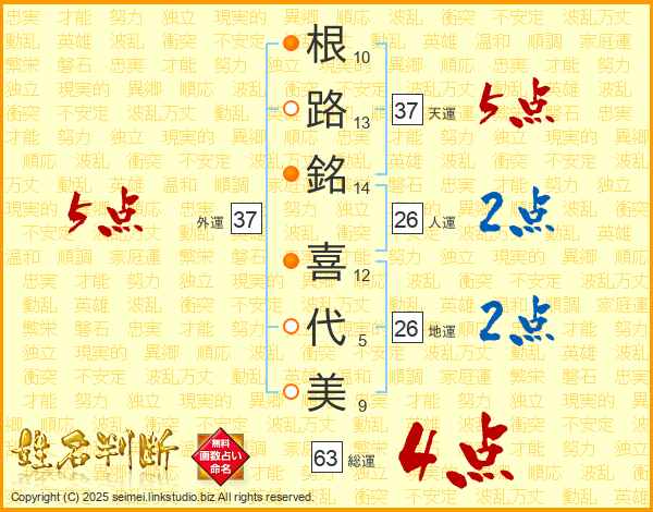 根(10画)路(13画)銘(14画) 喜(12画)代(5画)美(9画)