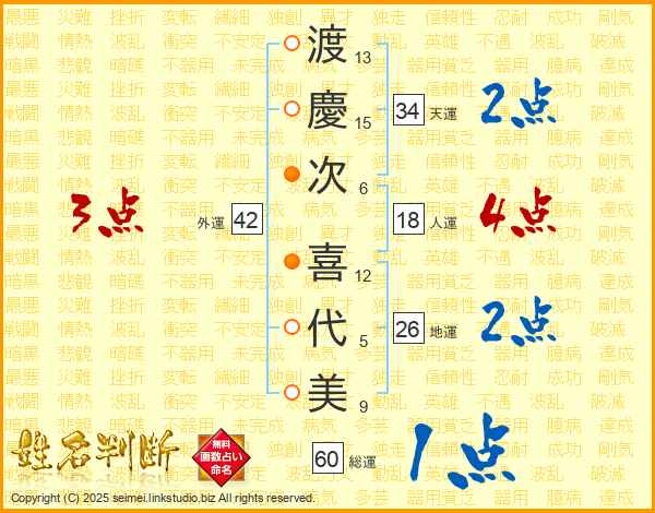 渡(13画)慶(15画)次(6画) 喜(12画)代(5画)美(9画)
