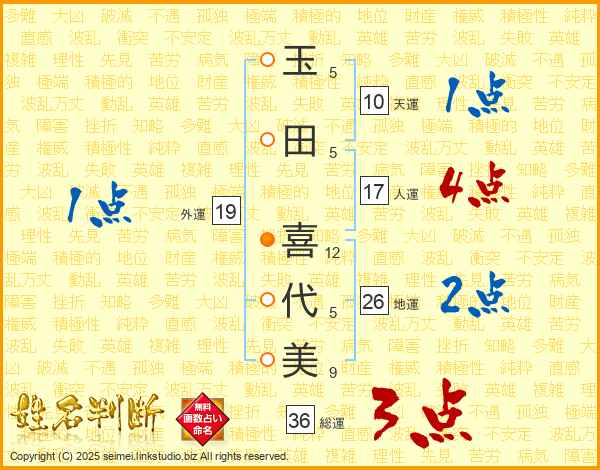 玉(5画)田(5画) 喜(12画)代(5画)美(9画)