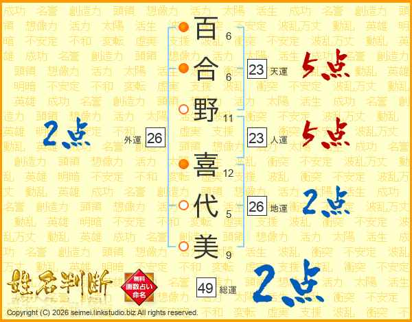 百(6画)合(6画)野(11画) 喜(12画)代(5画)美(9画)