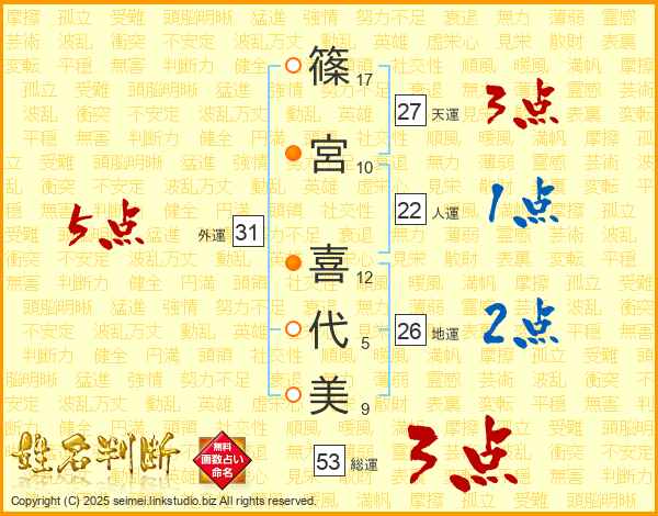 篠宮喜代美さんの総運は53画の3点!