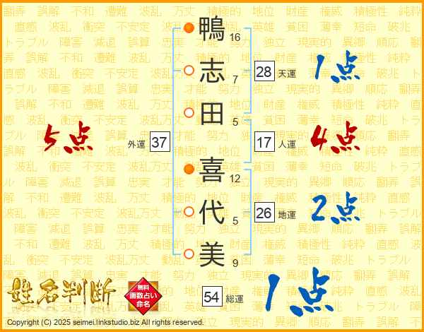 鴨(16画)志(7画)田(5画) 喜(12画)代(5画)美(9画)