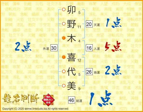 卯(5画)野(11画)木(4画) 喜(12画)代(5画)美(9画)