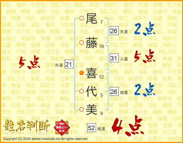尾(7画)藤(19画) 喜(12画)代(5画)美(9画)