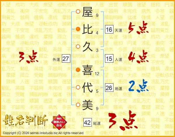 屋(9画)比(4画)久(3画) 喜(12画)代(5画)美(9画)