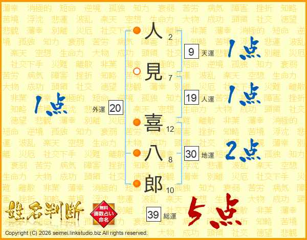 人(2画)見(7画) 喜(12画)八(8画)郎(10画)