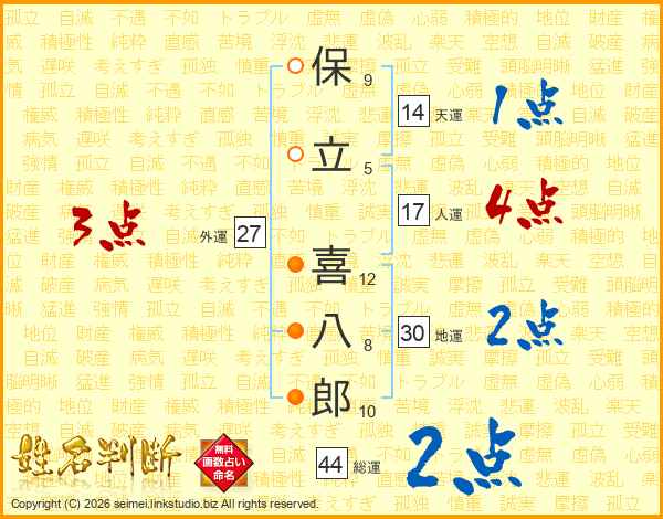 保(9画)立(5画) 喜(12画)八(8画)郎(10画)
