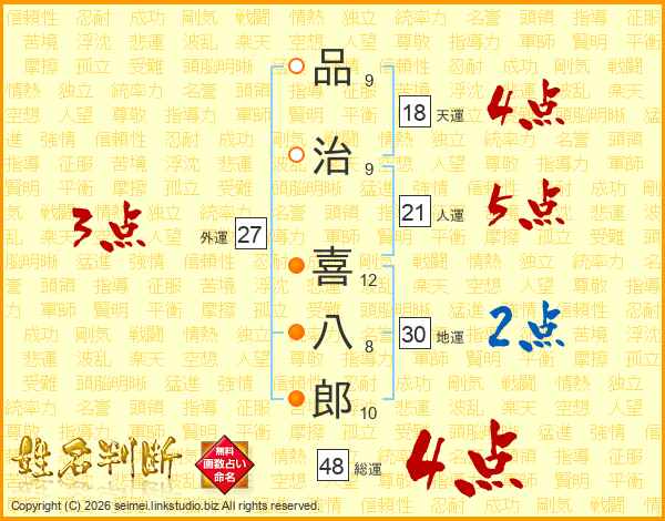 品(9画)治(9画) 喜(12画)八(8画)郎(10画)
