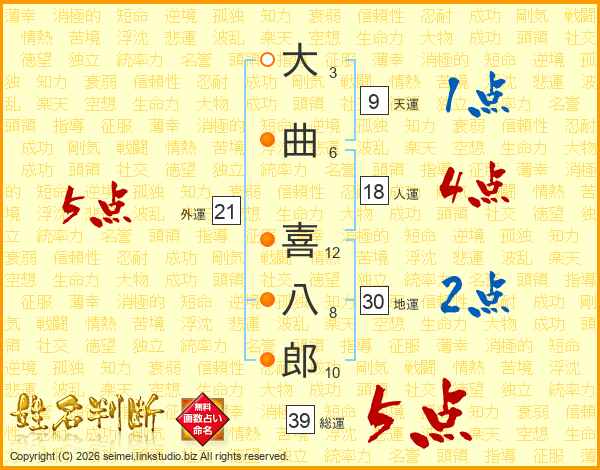 大(3画)曲(6画) 喜(12画)八(8画)郎(10画)