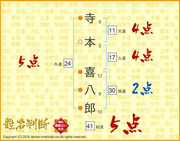 寺(6画)本(5画) 喜(12画)八(8画)郎(10画)