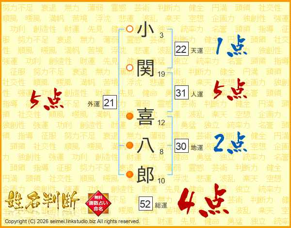 小(3画)関(19画) 喜(12画)八(8画)郎(10画)