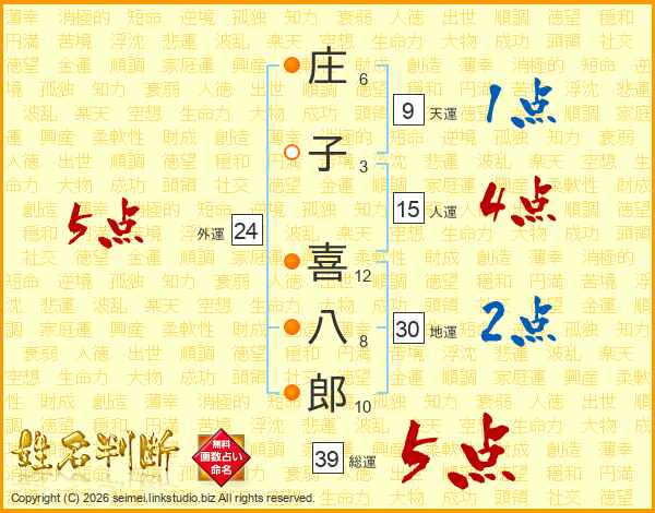 庄(6画)子(3画) 喜(12画)八(8画)郎(10画)