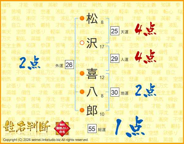 松(8画)沢(17画) 喜(12画)八(8画)郎(10画)