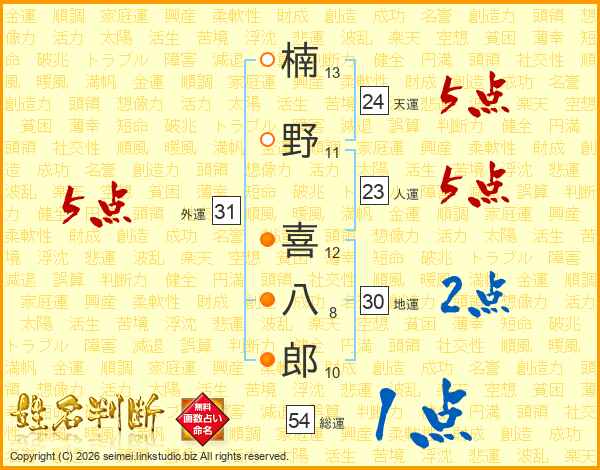 楠(13画)野(11画) 喜(12画)八(8画)郎(10画)