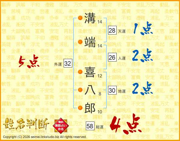 溝(14画)端(14画) 喜(12画)八(8画)郎(10画)
