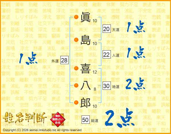 眞(10画)島(10画) 喜(12画)八(8画)郎(10画)