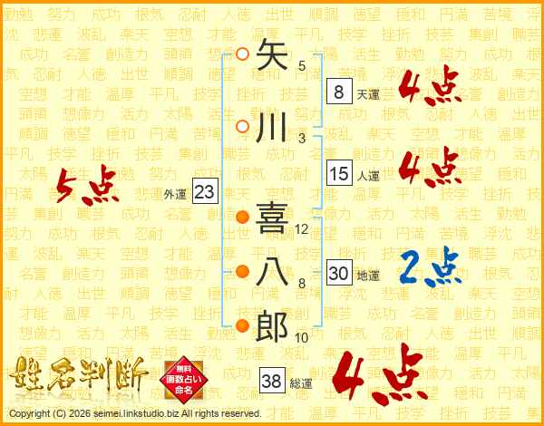 矢(5画)川(3画) 喜(12画)八(8画)郎(10画)