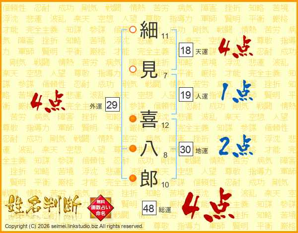 細(11画)見(7画) 喜(12画)八(8画)郎(10画)