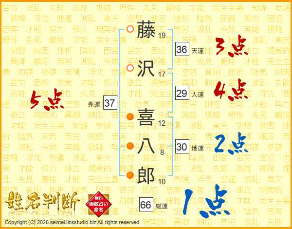 藤(19画)沢(17画) 喜(12画)八(8画)郎(10画)