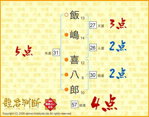 飯(13画)嶋(14画) 喜(12画)八(8画)郎(10画)