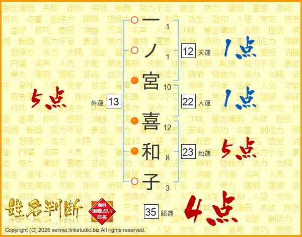 一(1画)ノ(1画)宮(10画) 喜(12画)和(8画)子(3画)