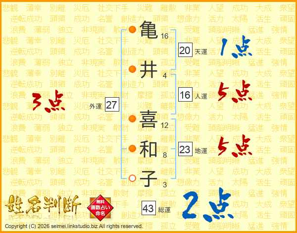 亀(16画)井(4画) 喜(12画)和(8画)子(3画)