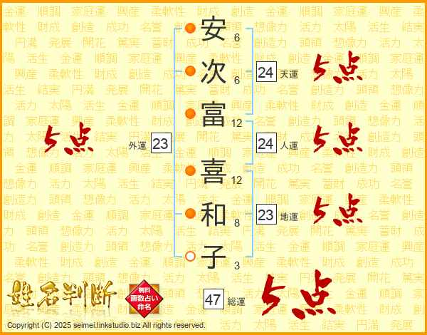 安(6画)次(6画)富(12画) 喜(12画)和(8画)子(3画)