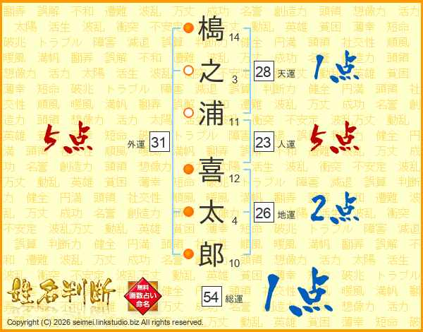槝(14画)之(3画)浦(11画) 喜(12画)太(4画)郎(10画)