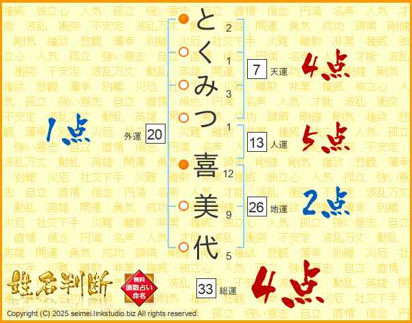 と(2画)く(1画)み(3画)つ(1画) 喜(12画)美(9画)代(5画)