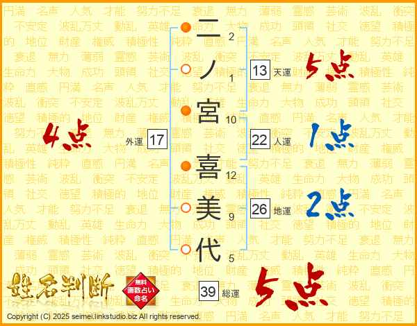 二(2画)ノ(1画)宮(10画) 喜(12画)美(9画)代(5画)