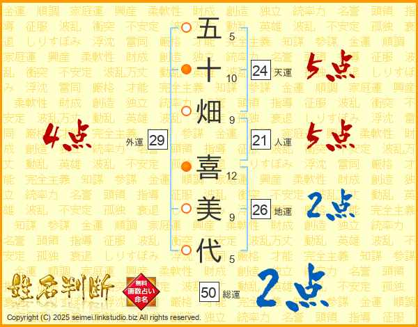 五(5画)十(10画)畑(9画) 喜(12画)美(9画)代(5画)