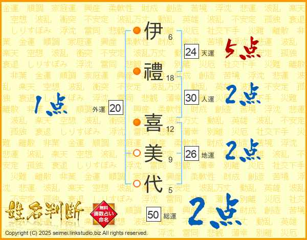 伊(6画)禮(18画) 喜(12画)美(9画)代(5画)