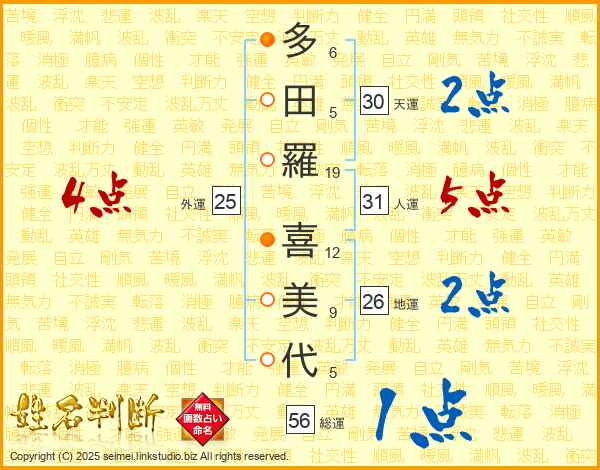 多(6画)田(5画)羅(19画) 喜(12画)美(9画)代(5画)