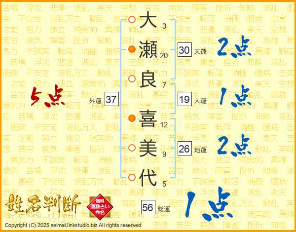 大(3画)瀬(20画)良(7画) 喜(12画)美(9画)代(5画)