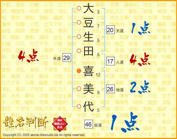 大豆生田喜美代さんの地運は26画の2点!