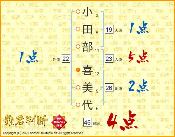 小(3画)田(5画)部(11画) 喜(12画)美(9画)代(5画)