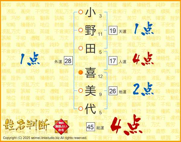 小(3画)野(11画)田(5画) 喜(12画)美(9画)代(5画)