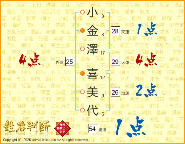 小(3画)金(8画)澤(17画) 喜(12画)美(9画)代(5画)
