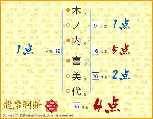 木(4画)ノ(1画)内(4画) 喜(12画)美(9画)代(5画)