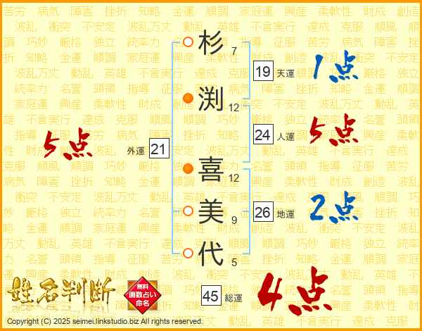 杉(7画)渕(12画) 喜(12画)美(9画)代(5画)