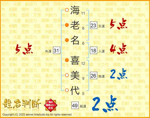 海(11画)老(6画)名(6画) 喜(12画)美(9画)代(5画)