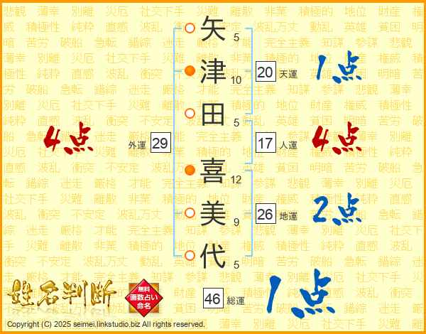 矢(5画)津(10画)田(5画) 喜(12画)美(9画)代(5画)