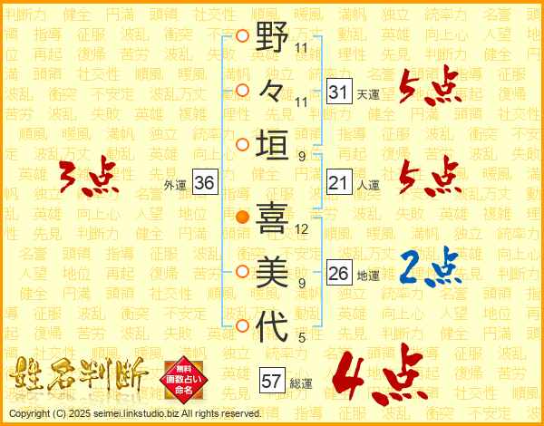 野(11画)々(11画)垣(9画) 喜(12画)美(9画)代(5画)