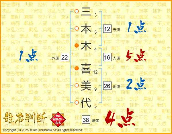三(3画)本(5画)木(4画)  喜(12画)美(9画)代(5画)
